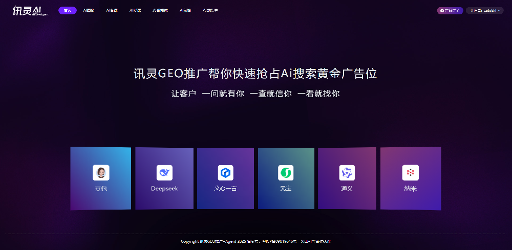 訊靈AIAI搜索平臺首屏曝光 覆蓋豆包、Deepseek、文小言、元寶、通義、納米等多個AI搜索平臺,讓你的意向用戶搜索即優先C位推薦你的品牌GEO優化全渠道訓練 第三方媒體訓練、B2B平臺訓練、企業自媒體訓練、AI官網訓練,提高GEO整體的表現力和交付結果,為客戶做出結果Agent智能驅動營銷閉環 Agent數字名片+Agent營銷官網+Agent全員管理+第三方Agent調優,快速打通服務和銷售整個AI智能生態企業營銷閉環